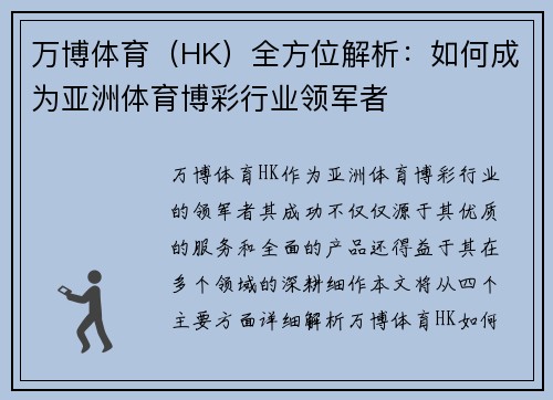 万博体育(HK)作为亚洲体育博彩行业的领军者,其成功不仅仅源于其优质的服务和全面的产品,还得益于其在多个领域的深耕细作。本文将从四个主要方面详细解析万博体育(HK)如何成为亚洲体育博彩行业的领导者:品牌建设与市场定位、技术创新与平台优化、用户体验与客户服务以及合规性与法律保障。通过对这些领域的分析,可以全面了解万博体育(HK)在竞争激烈的亚洲体育博彩市场中脱颖而出的原因。接下来,将逐一探讨这些方面的具体内容。